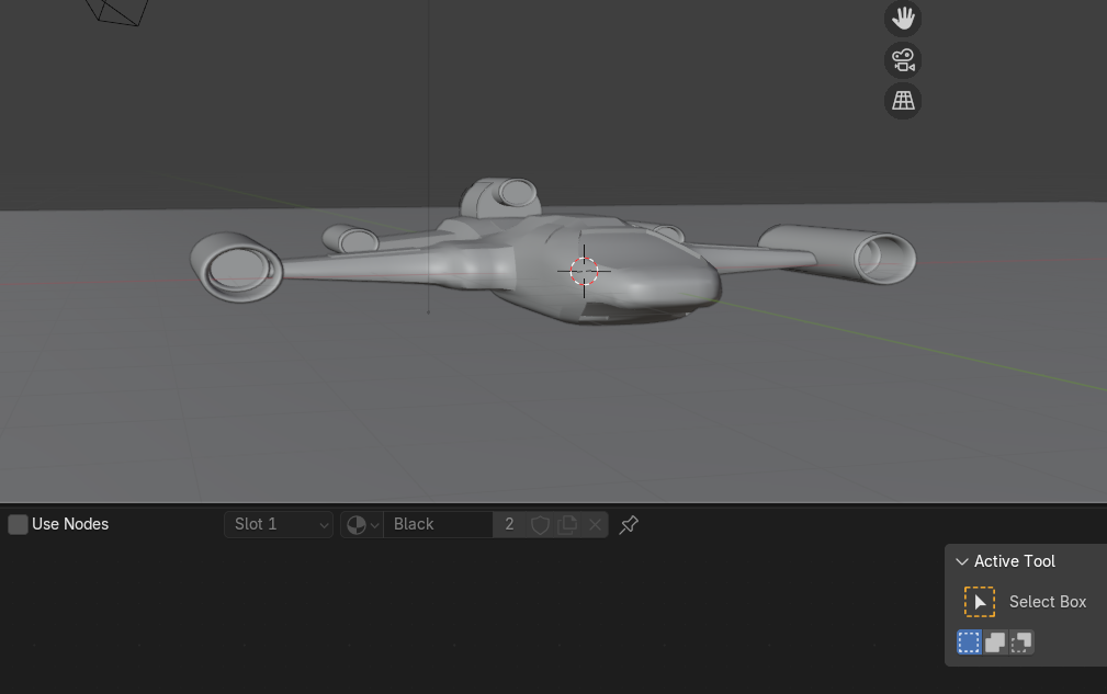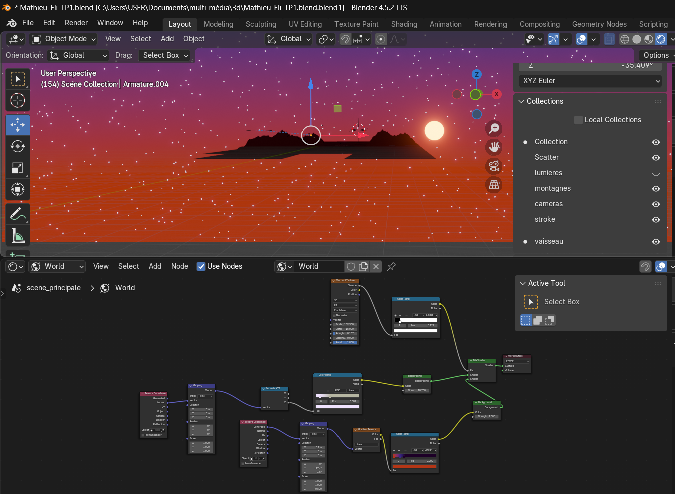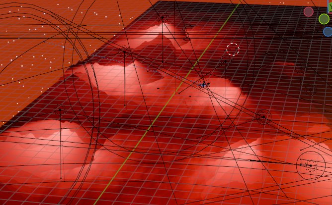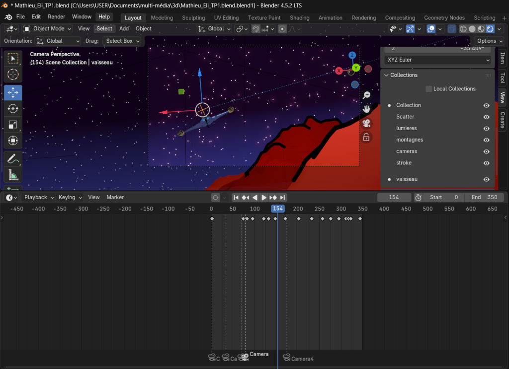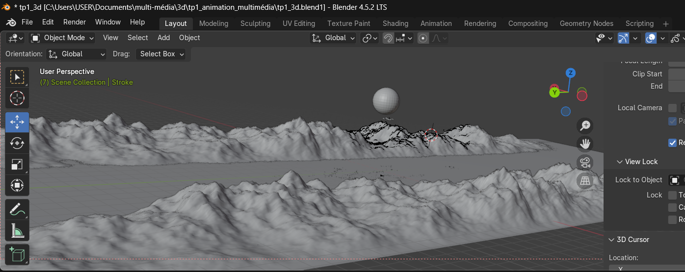Maintenant que le principal du vaisseau a été réalisé, il fallait que je modélise le terrain et le décor. La sphère que nous pouvons apercevoir servira de soleil plus tard. Des contours ont aussi été ajoutés sur les montagnes pour voir l’effet qu’elles donneraient à la caméra en 2D.