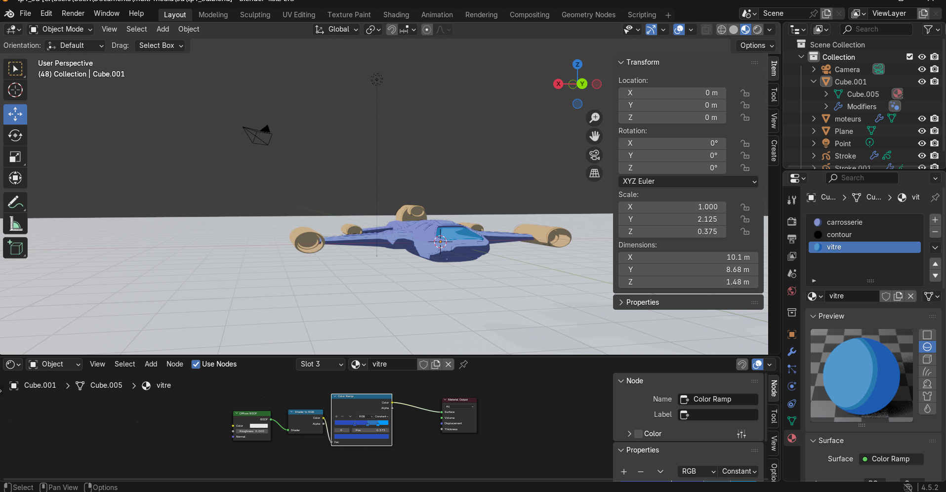 Pour commencer, j’ai modélisé ce vaisseau à partir d’un cube à l’aide de Blender. Un modificateur Smooth by Angle a ensuite été ajouté afin d’arrondir les formes du vaisseau.